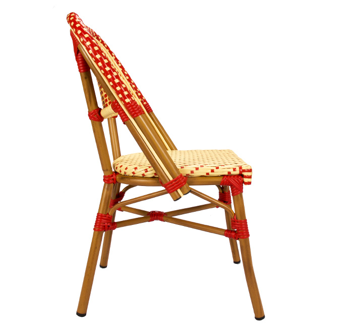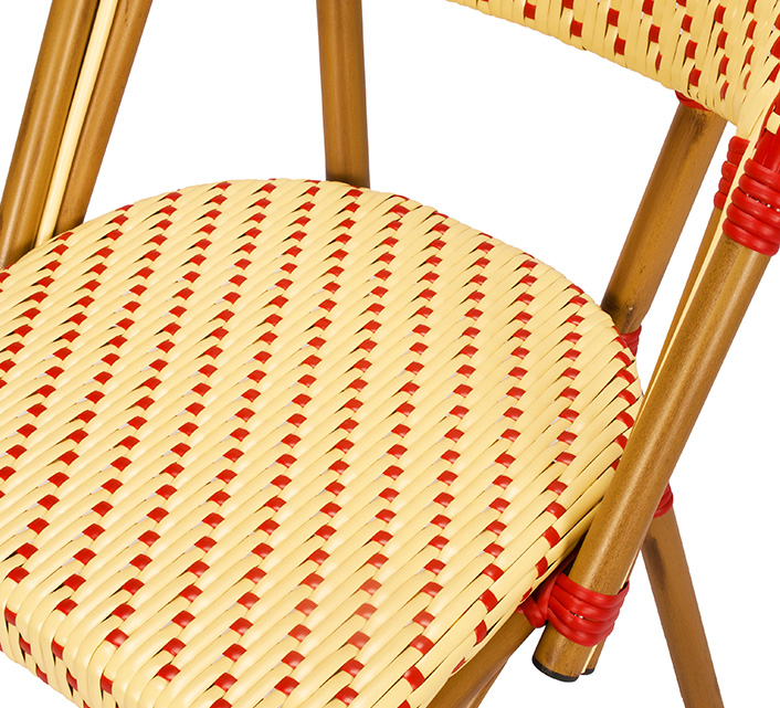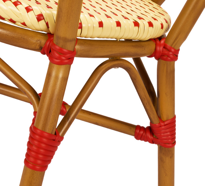 Une chaise bistrot aluminium parisienne beige et rouge très confortable. A la fois vintage et complétement tendance, cette chaise de bistrot tressée est la star incontournable de votre terrasse cet été. Souple, le cannage tressé main vous procurera un incroyable confort. Ses matériaux sont remarquables pour leur solidité et légèreté. Excellente résistance aux agressions climatiques : idéal pour le bord de mer. Cette chaise bistrot rotin conçue pour une utilisation extérieure peut aussi convenir en intérieur.