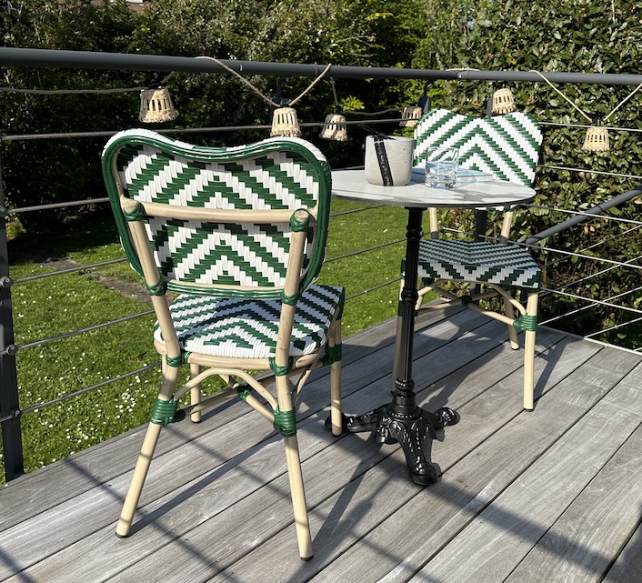 Une chaise bistrot parisienne aluminium verte et blanche très confortable. A la fois vintage et complétement tendance, cette chaise de bistrot tressée est la star incontournable de votre terrasse cet été. Souple, le cannage tressé main vous procurera un incroyable confort. Ses matériaux sont remarquables pour leur solidité et légèreté. Excellente résistance aux agressions climatiques : idéal pour le bord de mer. Cette chaise bistrot rotin conçue pour une utilisation extérieure peut aussi convenir en intérieur.