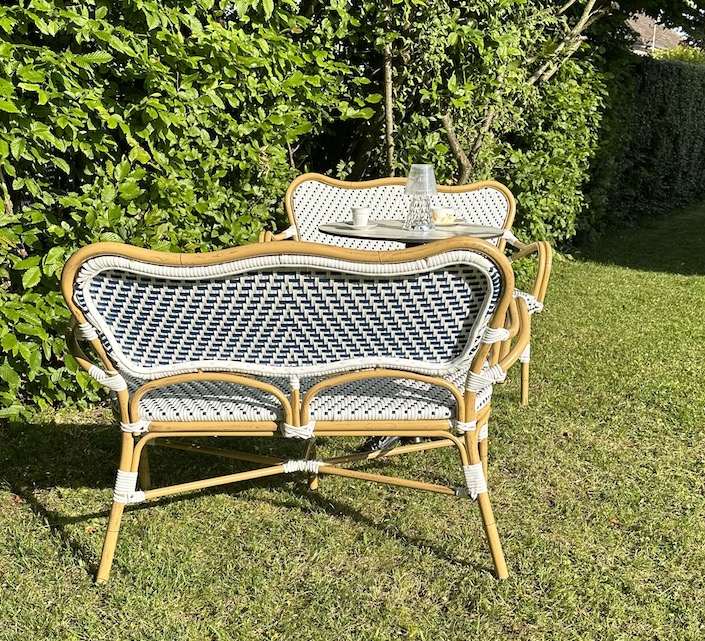 Une banquette bistrot parisienne polyrotin blanche et bleue très confortable. A la fois vintage et complétement tendance, cette banquette style bistrot est la star incontournable de votre terrasse cet été. Souple, la résine tressée main de cette chaise vous procurera un incroyable confort. Ses matériaux sont remarquables pour leur solidité et légèreté. Excellente résistance aux agressions climatiques : idéal pour le bord de mer. Cette banquette poly rotin conçue pour une utilisation extérieure peut aussi convenir en intérieur.