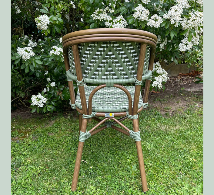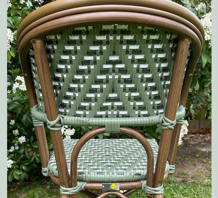 Une chaise bistrot aluminium parisienne verte olive et blanche très confortable. A la fois vintage et complétement tendance, cette chaise de bistrot tressée est la star incontournable de votre terrasse cet été. Souple, le cannage tressé main vous procurera un incroyable confort. Ses matériaux sont remarquables pour leur solidité et légèreté. Excellente résistance aux agressions climatiques : idéal pour le bord de mer. Cette chaise bistrot rotin conçue pour une utilisation extérieure peut aussi convenir en intérieur.