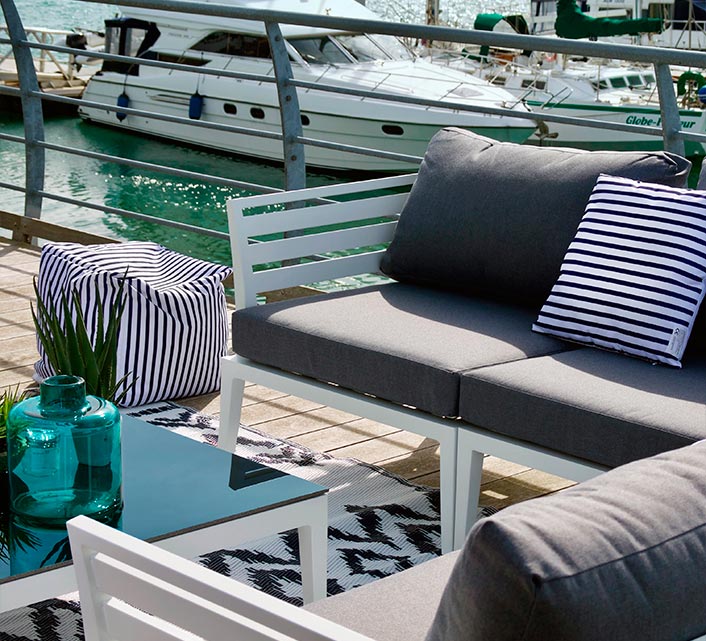 Coussin d'extérieur blanc marinière bleu marine 45x45cm