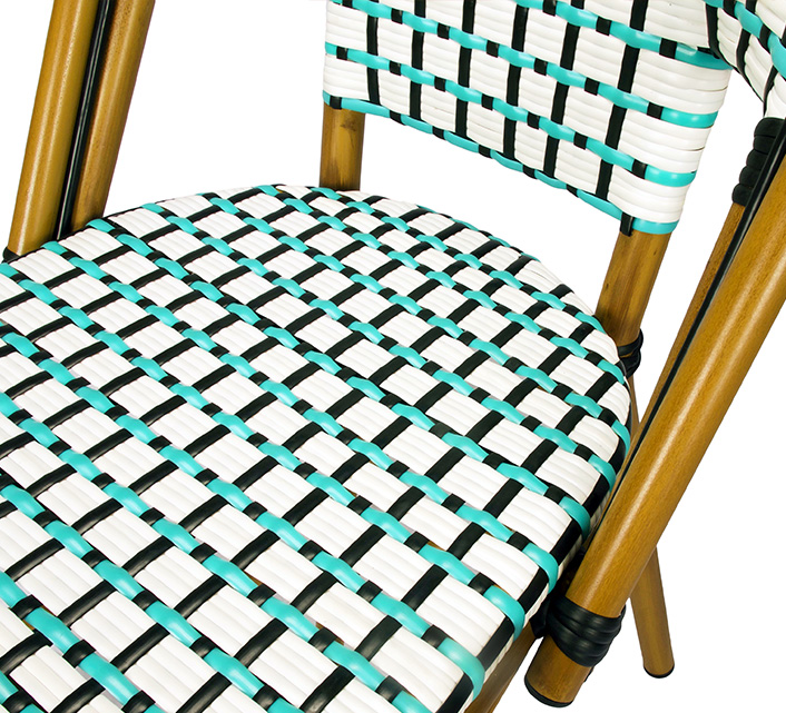 Une chaise bistrot aluminium parisienne  bleue et blanche très confortable. A la fois vintage et complétement tendance, cette chaise de bistrot tressée est la star incontournable de votre terrasse cet été. Souple, le cannage tressé main vous procurera un incroyable confort. Ses matériaux sont remarquables pour leur solidité et légèreté. Excellente résistance aux agressions climatiques : idéal pour le bord de mer. Cette chaise bistrot rotin conçue pour une utilisation extérieure peut aussi convenir en intérieur.