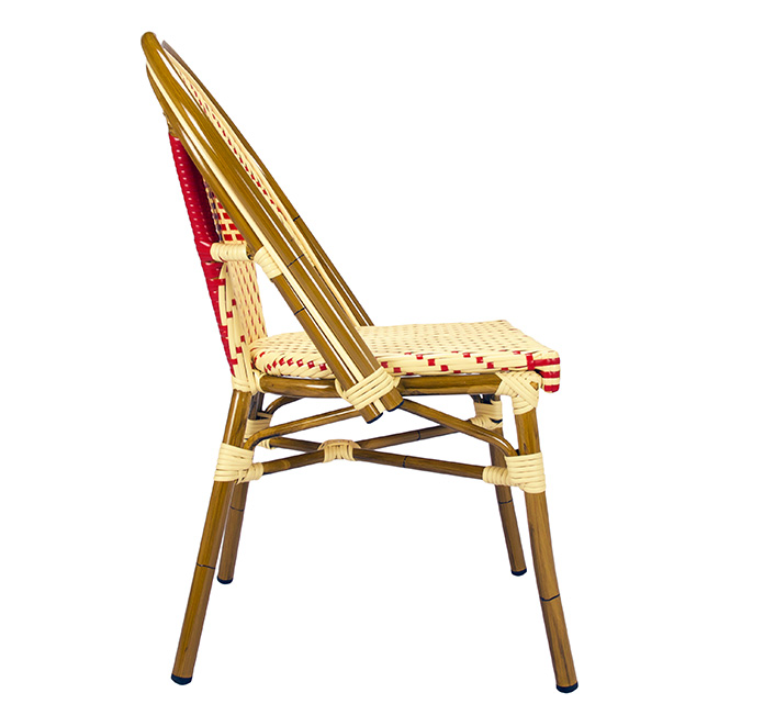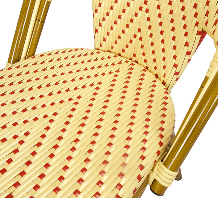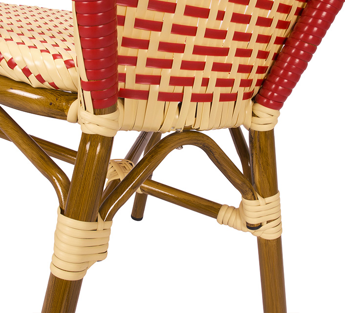 Une chaise bistrot aluminium parisienne beige et rouge très confortable. A la fois vintage et complétement tendance, cette chaise de bistrot tressée est la star incontournable de votre terrasse cet été. Souple, le cannage tressé main vous procurera un incroyable confort. Ses matériaux sont remarquables pour leur solidité et légèreté. Excellente résistance aux agressions climatiques : idéal pour le bord de mer. Cette chaise bistrot rotin conçue pour une utilisation extérieure peut aussi convenir en intérieur.