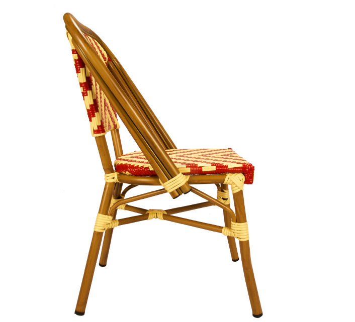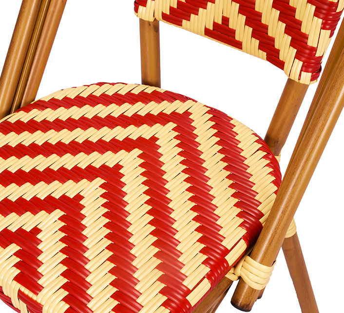 Une chaise bistrot aluminium parisienne rouge et beige très confortable. A la fois vintage et complétement tendance, cette chaise de bistrot tressée est la star incontournable de votre terrasse cet été. Souple, le cannage tressé main vous procurera un incroyable confort. Ses matériaux sont remarquables pour leur solidité et légèreté. Excellente résistance aux agressions climatiques : idéal pour le bord de mer. Cette chaise bistrot rotin conçue pour une utilisation extérieure peut aussi convenir en intérieur.