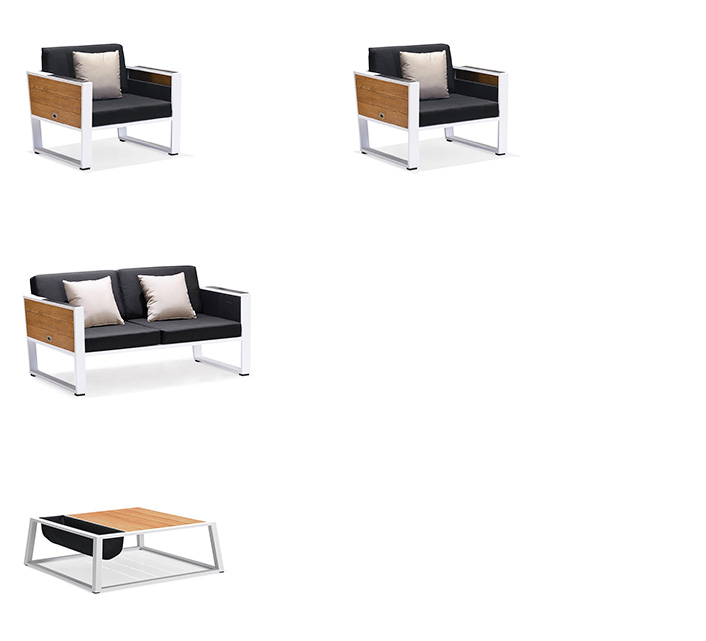 Ce salon bas de jardin aluminium blanc 4 places offre une finition exceptionnelle. Il est composé par 2 fauteuils, 1 canapé 2 places et 1 table basse plateau en teck naturel avec bac semi rigide. On adore la structure épurée de ce salon de jardin aluminium blanc. De grands coussins noirs imperméabilisés viennent habiller l'ensemble pour votre plus grand confort. Idéal pour le bord de mer. Ce salon de jardin très contemporain peut s'intégrer dans différents types d'environnement en extérieur comme en intérieur.
