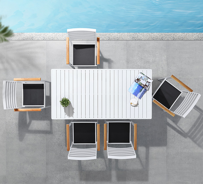 Le mobilier est très robuste, résistant aux intempéries et aux UV et très facile à nettoyer.