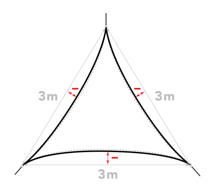 Les mesures de la voile d'ombrage sont prises d'anneau à anneau. Nous vous rappelons que le bord des voiles d'ombrage étant incurvé vers l'intérieur, sa largeur diminue de 60 à 80 cm au milieu.