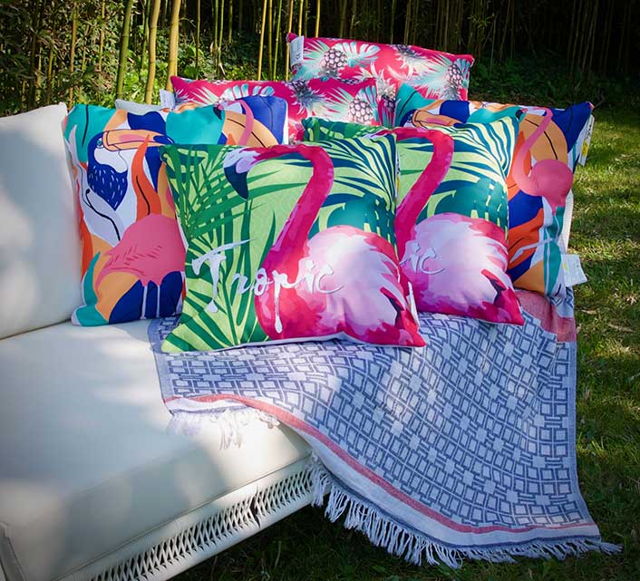 Descriptif : Coussin d'extérieur vert imprimé tropic flamant rose 45x45cm