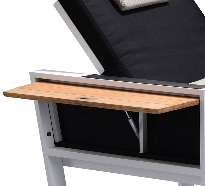 Au summum du confort : La construction élégante est rehaussée par des parties latérales en bois de teck. Le panneau se transforme en tablette pouvant être ouvert et fermé.