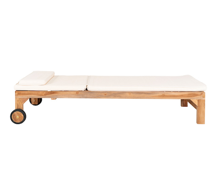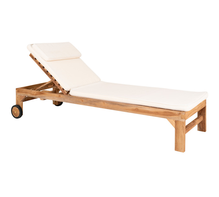 Un bain de soleil teck Andorre avec coussin beige. Entièrement en teck, assise en teck et grands coussins imperméabilisés couleur ivoire garnis de mousse polyester pour votre plus grand confort. On aime la structure en teck remarquable pour sa solidité/légèreté. Résistant aux agressions climatiques : un bain de soleil haut de gamme tout à fait idéal pour le bord de mer.