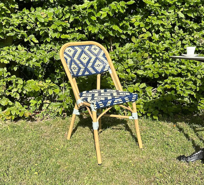 Une chaise bistrot aluminium parisienne bleue et verte anis très confortable. A la fois vintage et complétement tendance, cette chaise de bistrot tressée est la star incontournable de votre terrasse cet été. Souple, le cannage tressé main vous procurera un incroyable confort. Ses matériaux sont remarquables pour leur solidité et légèreté. Excellente résistance aux agressions climatiques : idéal pour le bord de mer. Cette chaise bistrot rotin conçue pour une utilisation extérieure peut aussi convenir en intérieur.