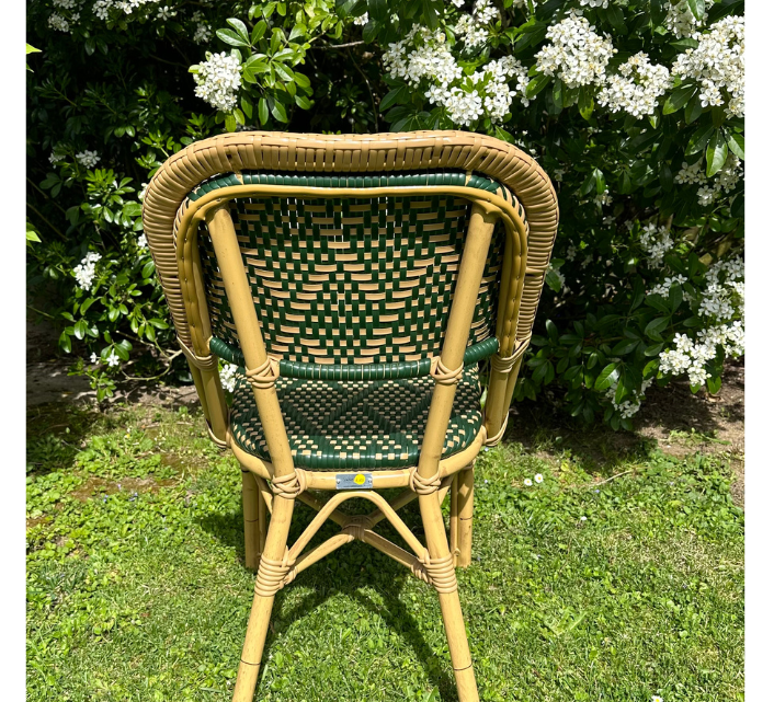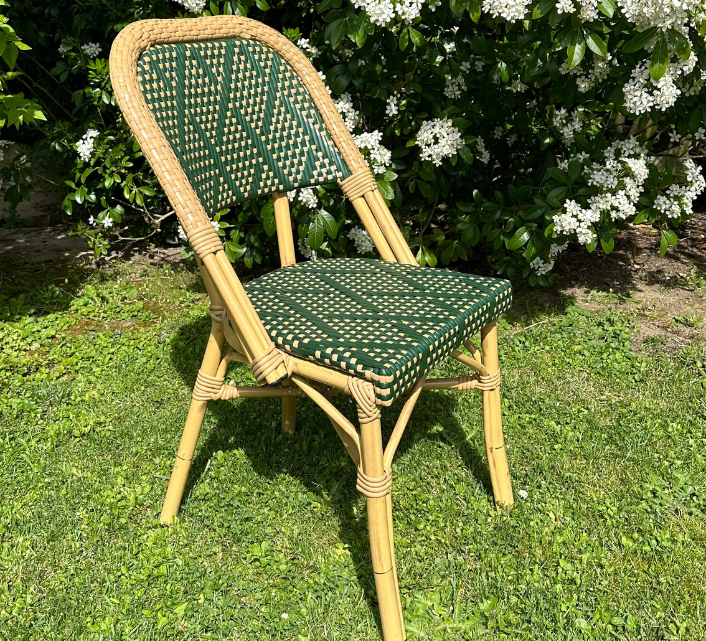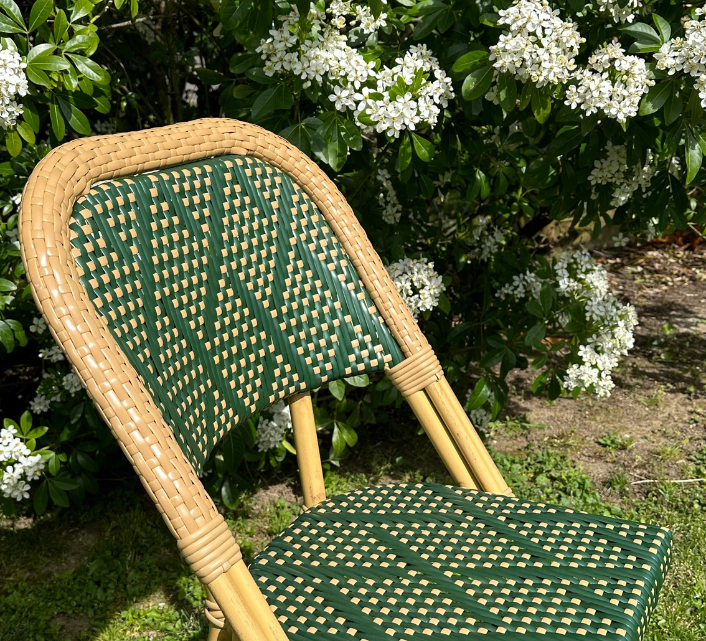 Une chaise bistrot aluminium parisienne verte et beige très confortable. A la fois vintage et complétement tendance, cette chaise de bistrot tressée est la star incontournable de votre terrasse cet été. Souple, le cannage tressé main vous procurera un incroyable confort. Ses matériaux sont remarquables pour leur solidité et légèreté. Excellente résistance aux agressions climatiques : idéal pour le bord de mer. Cette chaise bistrot rotin conçue pour une utilisation extérieure peut aussi convenir en intérieur.