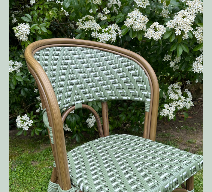 Une chaise bistrot aluminium parisienne verte olive et blanche très confortable. A la fois vintage et complétement tendance, cette chaise de bistrot tressée est la star incontournable de votre terrasse cet été. Souple, le cannage tressé main vous procurera un incroyable confort. Ses matériaux sont remarquables pour leur solidité et légèreté. Excellente résistance aux agressions climatiques : idéal pour le bord de mer. Cette chaise bistrot rotin conçue pour une utilisation extérieure peut aussi convenir en intérieur.