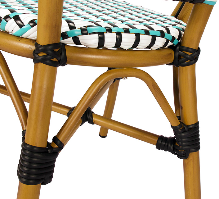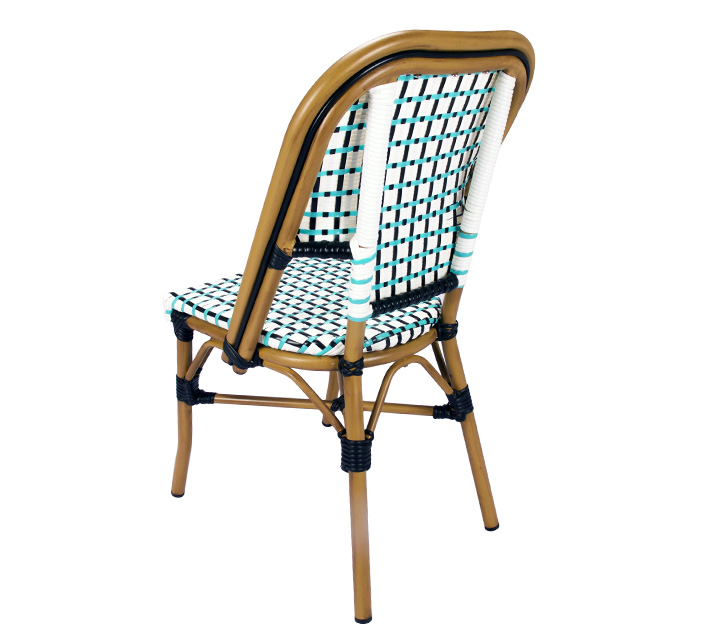 Une chaise bistrot aluminium parisienne  bleue et blanche très confortable. A la fois vintage et complétement tendance, cette chaise de bistrot tressée est la star incontournable de votre terrasse cet été. Souple, le cannage tressé main vous procurera un incroyable confort. Ses matériaux sont remarquables pour leur solidité et légèreté. Excellente résistance aux agressions climatiques : idéal pour le bord de mer. Cette chaise bistrot rotin conçue pour une utilisation extérieure peut aussi convenir en intérieur.