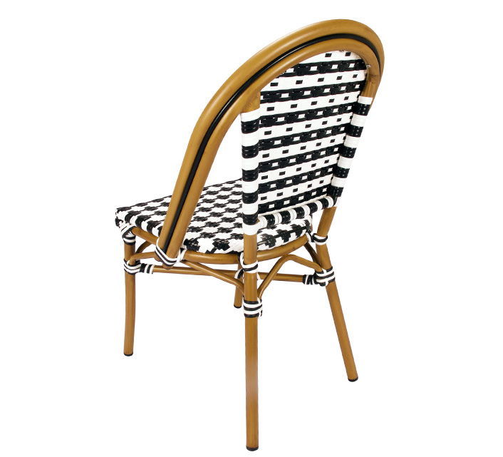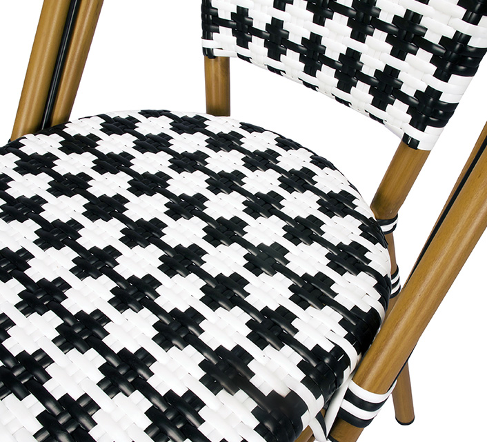 Une chaise bistrot aluminium parisienne noire et blanche très confortable. A la fois vintage et complétement tendance, cette chaise de bistrot tressée est la star incontournable de votre terrasse cet été. Souple, le cannage tressé main vous procurera un incroyable confort. Ses matériaux sont remarquables pour leur solidité et légèreté. Excellente résistance aux agressions climatiques : idéal pour le bord de mer. Cette chaise bistrot rotin conçue pour une utilisation extérieure peut aussi convenir en intérieur.