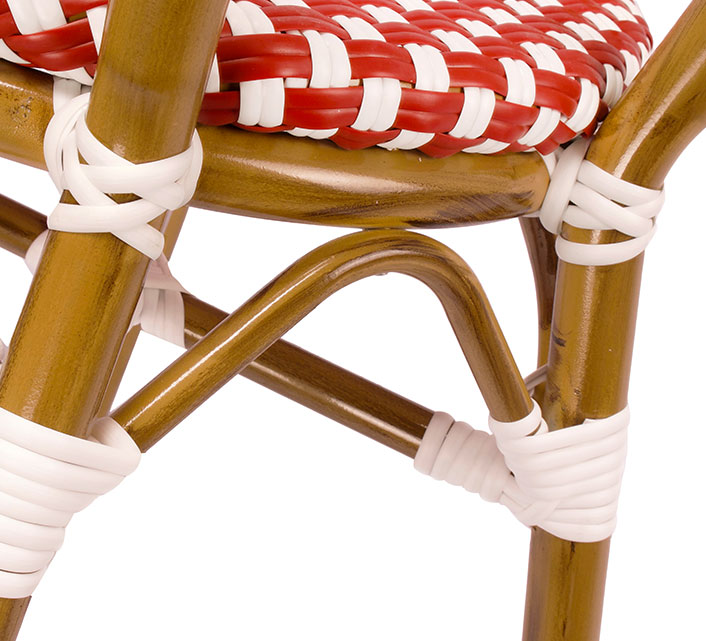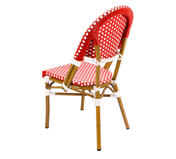 Une chaise bistrot aluminium parisienne rouge et blanche très confortable. A la fois vintage et complétement tendance, cette chaise de bistrot tressée est la star incontournable de votre terrasse cet été. Souple, le cannage tressé main vous procurera un incroyable confort. Ses matériaux sont remarquables pour leur solidité et légèreté. Excellente résistance aux agressions climatiques : idéal pour le bord de mer. Cette chaise bistrot rotin conçue pour une utilisation extérieure peut aussi convenir en intérieur.