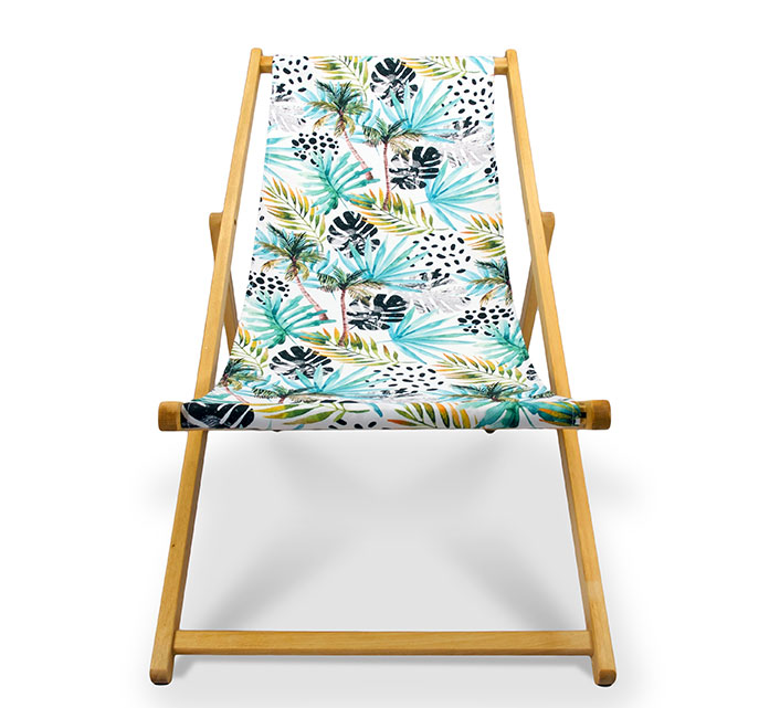 Complètement déco, cette chilienne bois motif jungle palmier vert s'invite sur la terrasse de votre jardin pour y créer une ambiance tropicale. Symbole de farniente, cette chilienne bois inclinable 3 positions est le compagnon idéal pour vos siestes cet été. On aime sa structure en acacia et sa toile 100% polyester, qui résiste aux intempéries. Ne cherchez plus, son motif original ne se trouve que chez Salon d’été !
