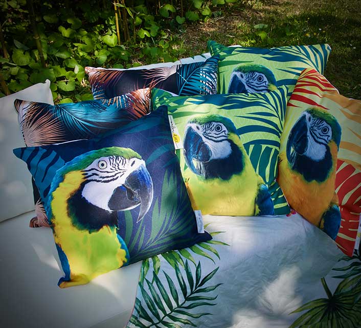 Descriptif : Coussin d'extérieur bleu nuit imprimé perroquet 45x45cm