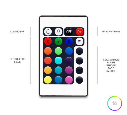 Télécommande pour luminaire LED multicolore : 16 couleurs sélectionnables selon plusieurs modes disponibles. Couleurs fixes, aléatoires, fondus, flash.