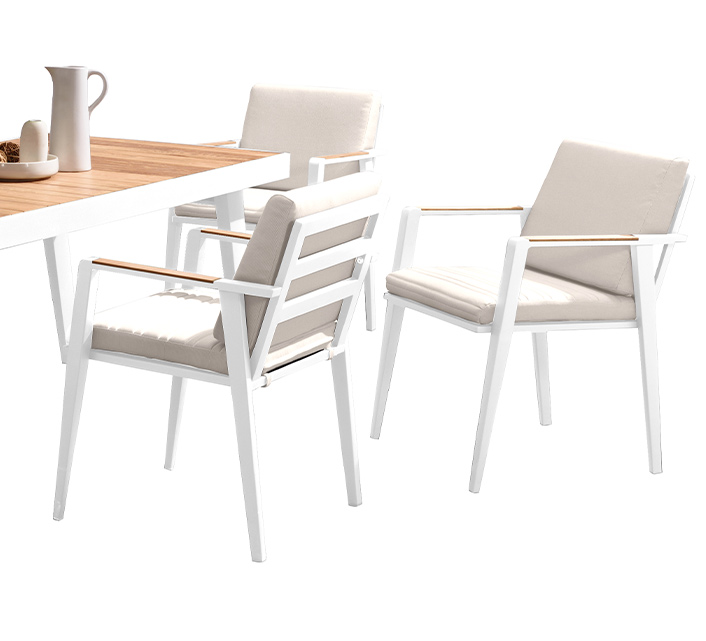 Cet ensemble table de jardin aluminium et bois teck 8 places blanc est composé par 1 table avec plateau en bois de teck et 8 chaises. Accoudoirs en teck et coussins imperméabilisés garnis de mousse polyester pour votre plus grand confort. Les matériaux de cet ensemble table et chaise de jardin utilisés dans l'industrie nautique sont remarquables pour leur solidité/légèreté et garantissent une excellente résistance aux agressions climatiques : tout à fait idéal pour le bord de mer.