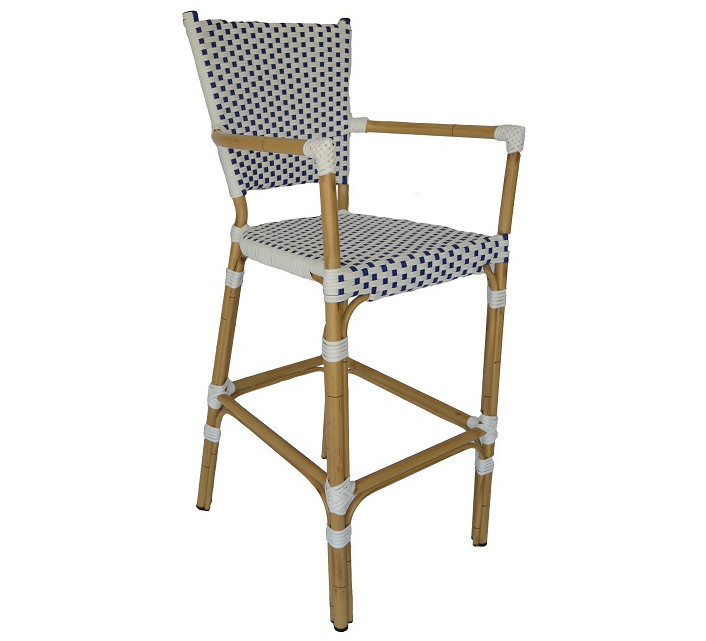 Une chaise haute Bistrot aluminium parisienne bleue et blanche très confortable. A la fois vintage et complétement tendance, cette chaise de bar bistrot tressée est la star incontournable de votre terrasse cet été. Souple, le cannage tressé main vous procurera un incroyable confort. Ses matériaux sont remarquables pour leur solidité et légèreté. Excellente résistance aux agressions climatiques : idéal pour le bord de mer. Cette chaise bistrot rotin conçue pour une utilisation extérieure peut aussi convenir en intérieur.