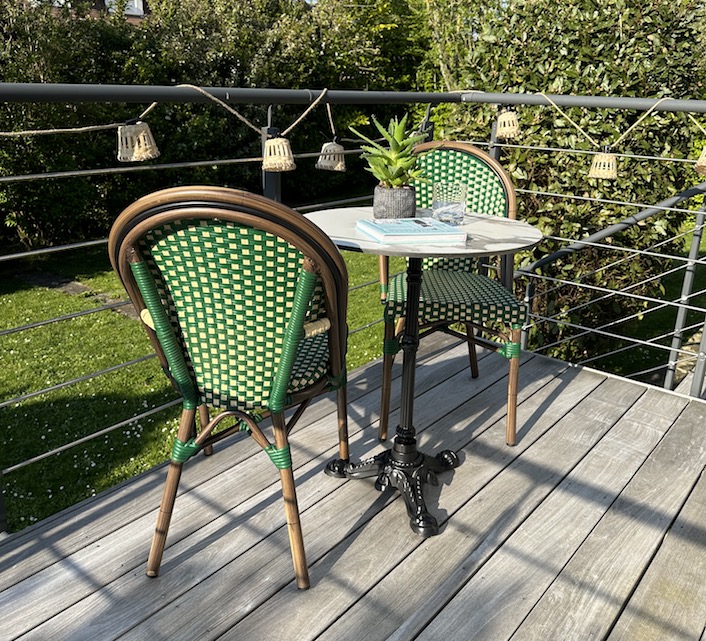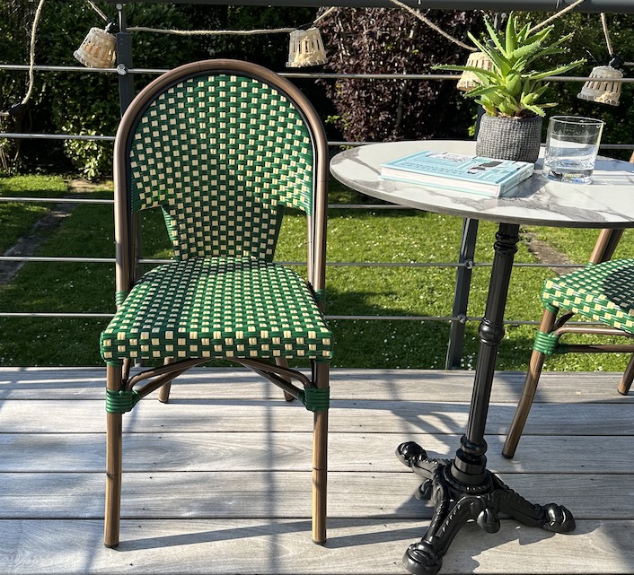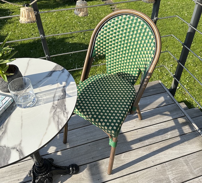 Une chaise bistrot parisienne aluminium verte et beige très confortable. A la fois vintage et complétement tendance, cette chaise de bistrot tressée est la star incontournable de votre terrasse cet été. Souple, le cannage tressé main vous procurera un incroyable confort. Ses matériaux sont remarquables pour leur solidité et légèreté. Excellente résistance aux agressions climatiques : idéal pour le bord de mer. Cette chaise bistrot rotin conçue pour une utilisation extérieure peut aussi convenir en intérieur.